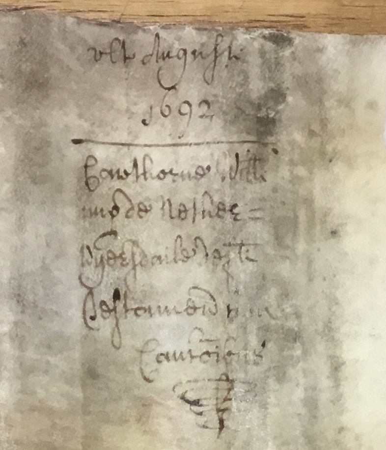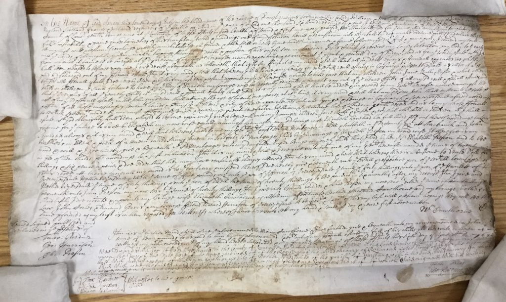 I then also looked at hard copies of some of the earlier wills which I had read on line. I found that William Cawthorne’s, dated 1692, was on a roll of stiff parchment. I had to weight the corners to keep it flat. It was written with a quill pen, in landscape format, so was difficult to follow. The digital version had been easier to read because I could zoom in to enlarge sections which were not easy to decipher.